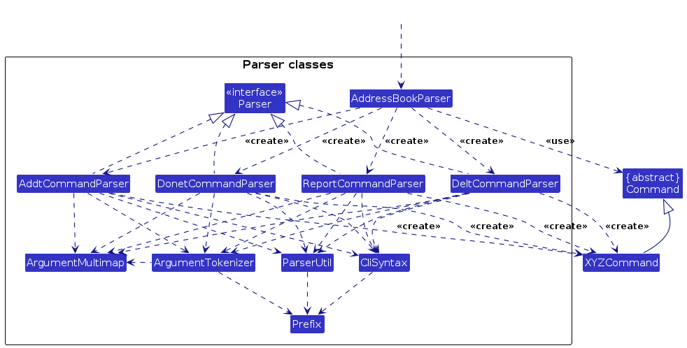 AddressBookParser class creates an XYZCommandParser (XYZ is a placeholder for the specific command name e.g., AddCommandParser) which uses the other classes shown above to parse the user command and create a XYZCommand object (e.g., AddCommand) which the AddressBookParser returns back as a Command object.XYZCommandParser classes (e.g., AddCommandParser, DeleteCommandParser, ...) inherit from the Parser interface so that they can be treated similarly where possible e.g, during testing.API : Model.java